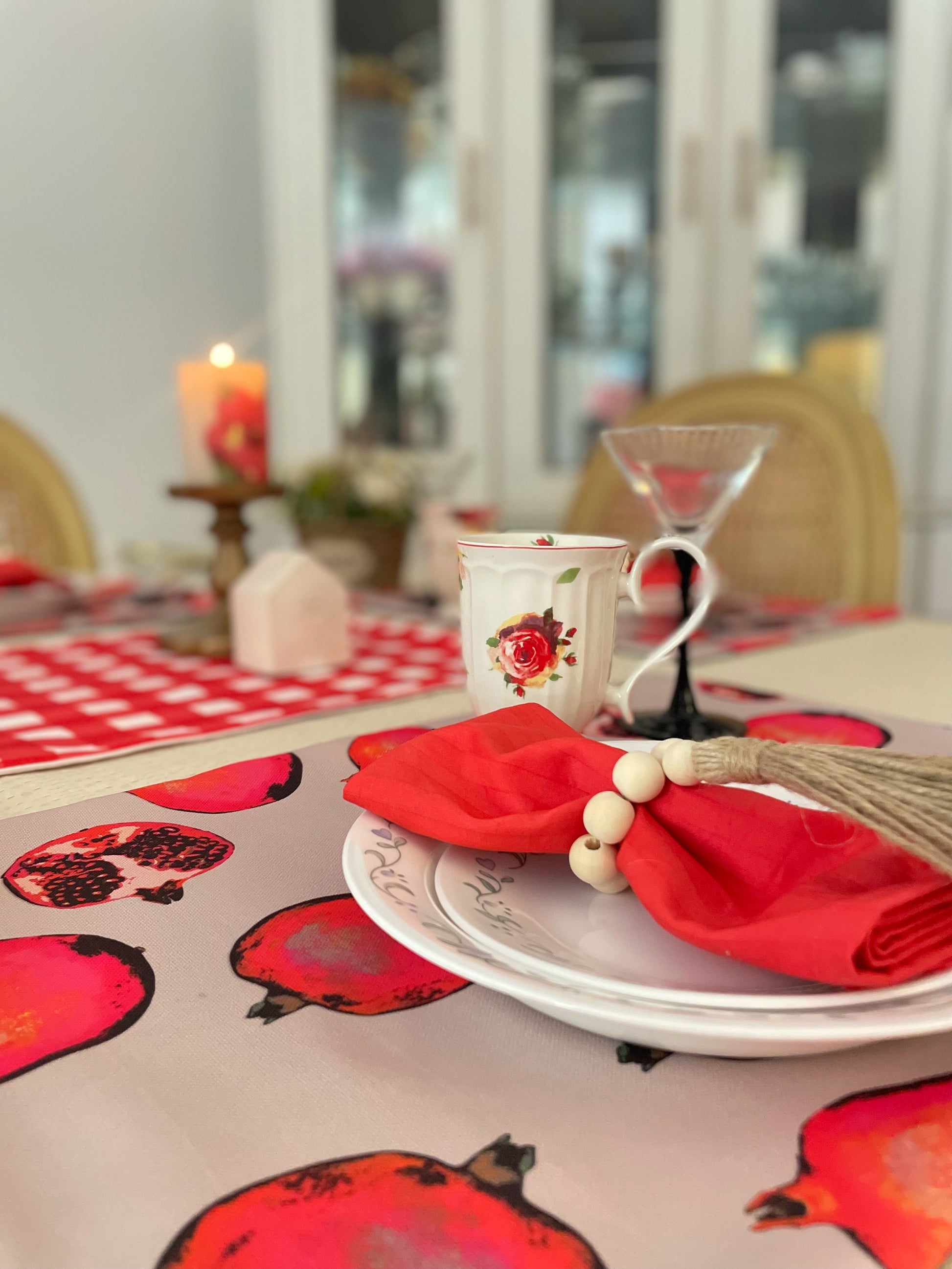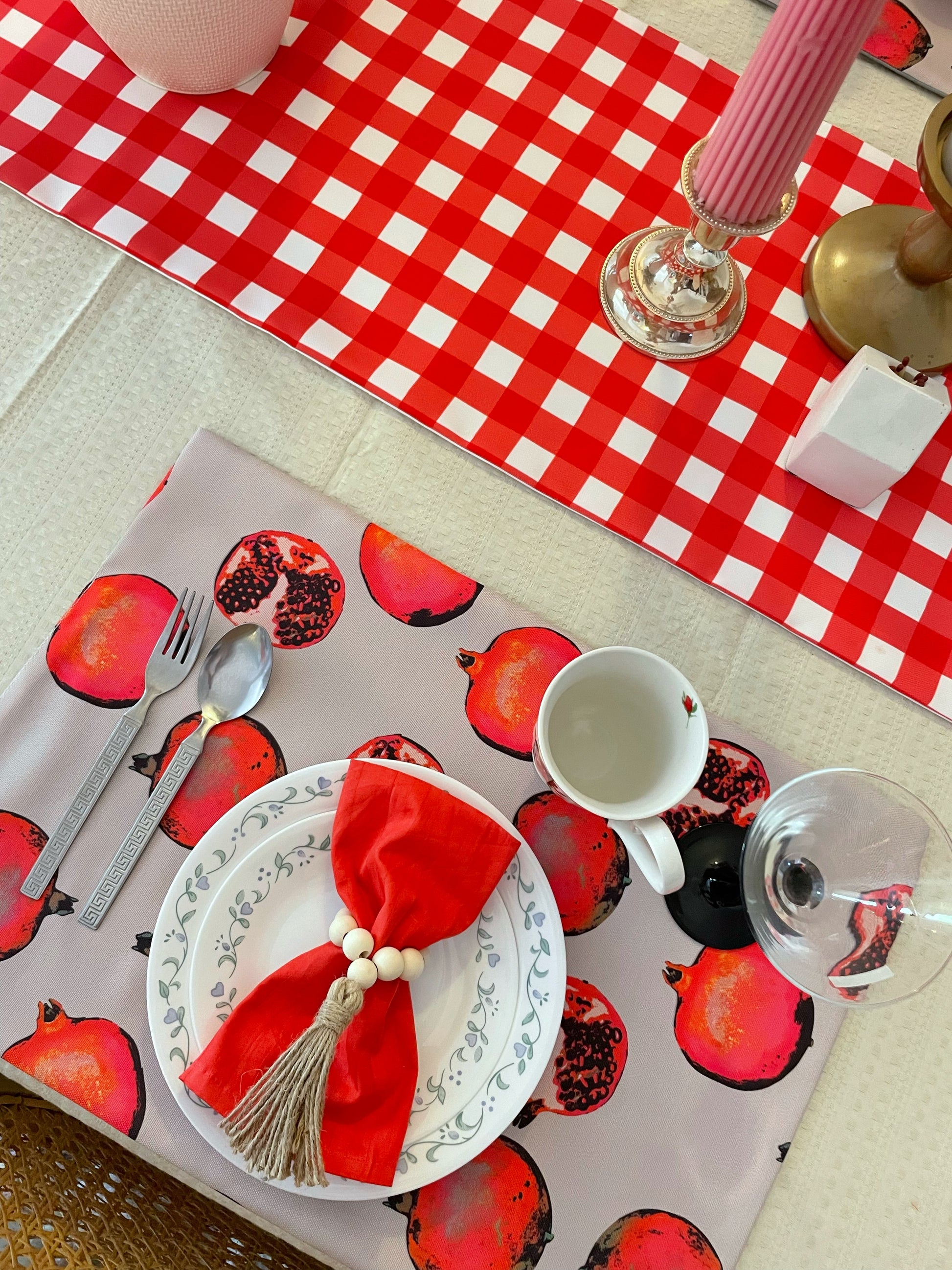 โThe foundation is a subtly textured beige embossed tablecloth, a canvas of understated elegance. Atop it dances our vibrant Redwood runner, a classic red and white gingham. Each place setting is adorned with the Pomegranate mats, their artistic rendering adding a touch of fruity vibrancy. Crisp, plain red napkins offer a bold contrast, held together by rustic wooden bead napkin rings. Glimpses of a matching Redwood lampshade in the background tie the entire look together.