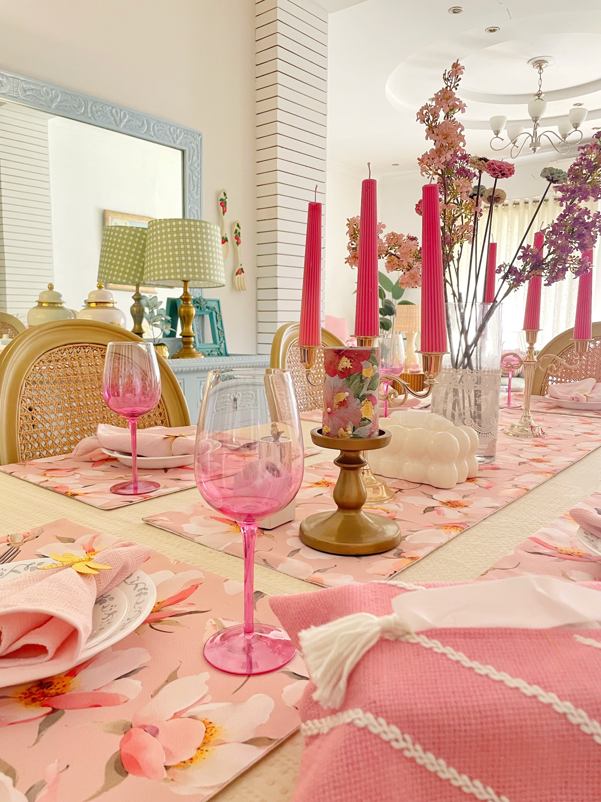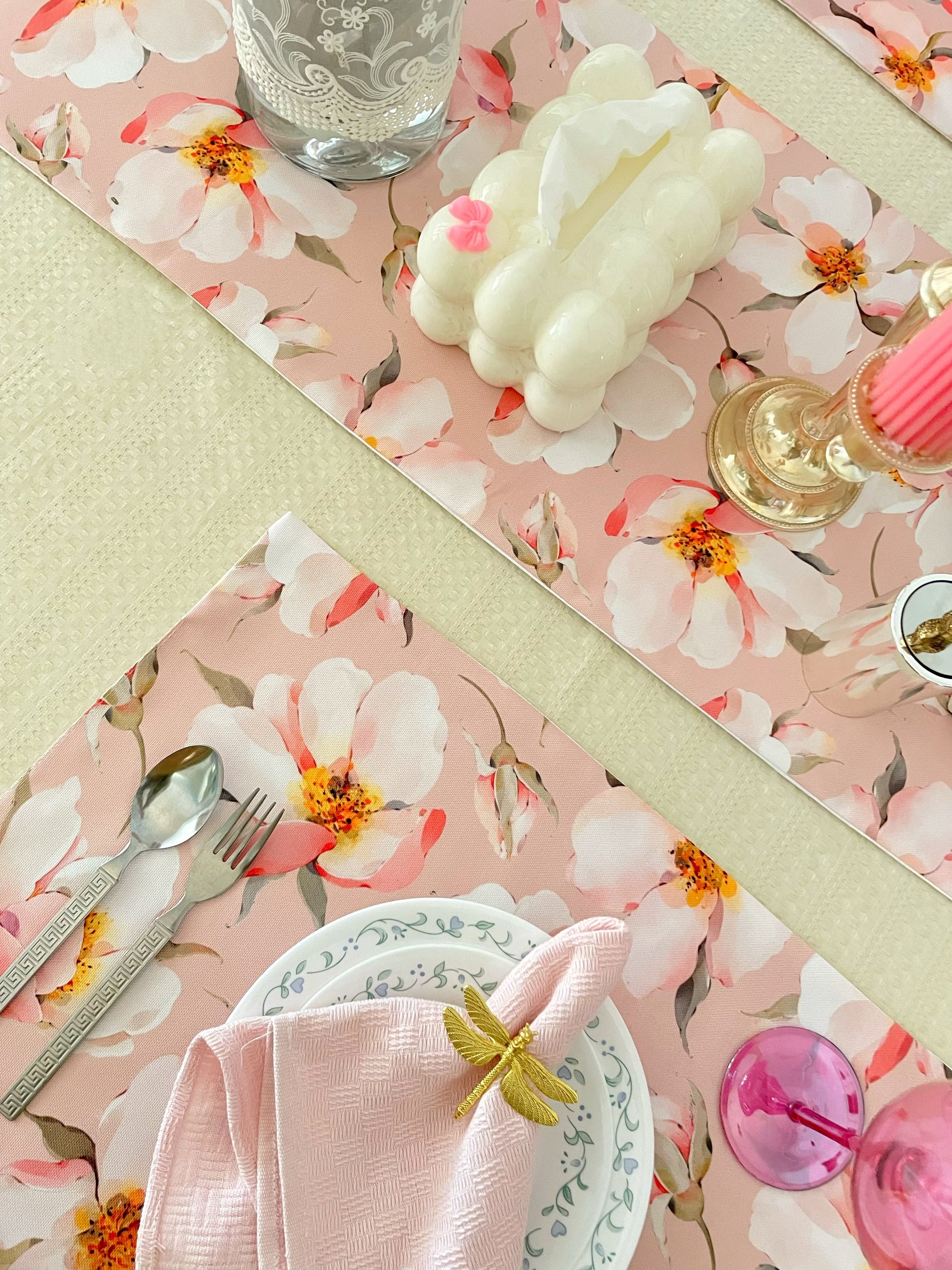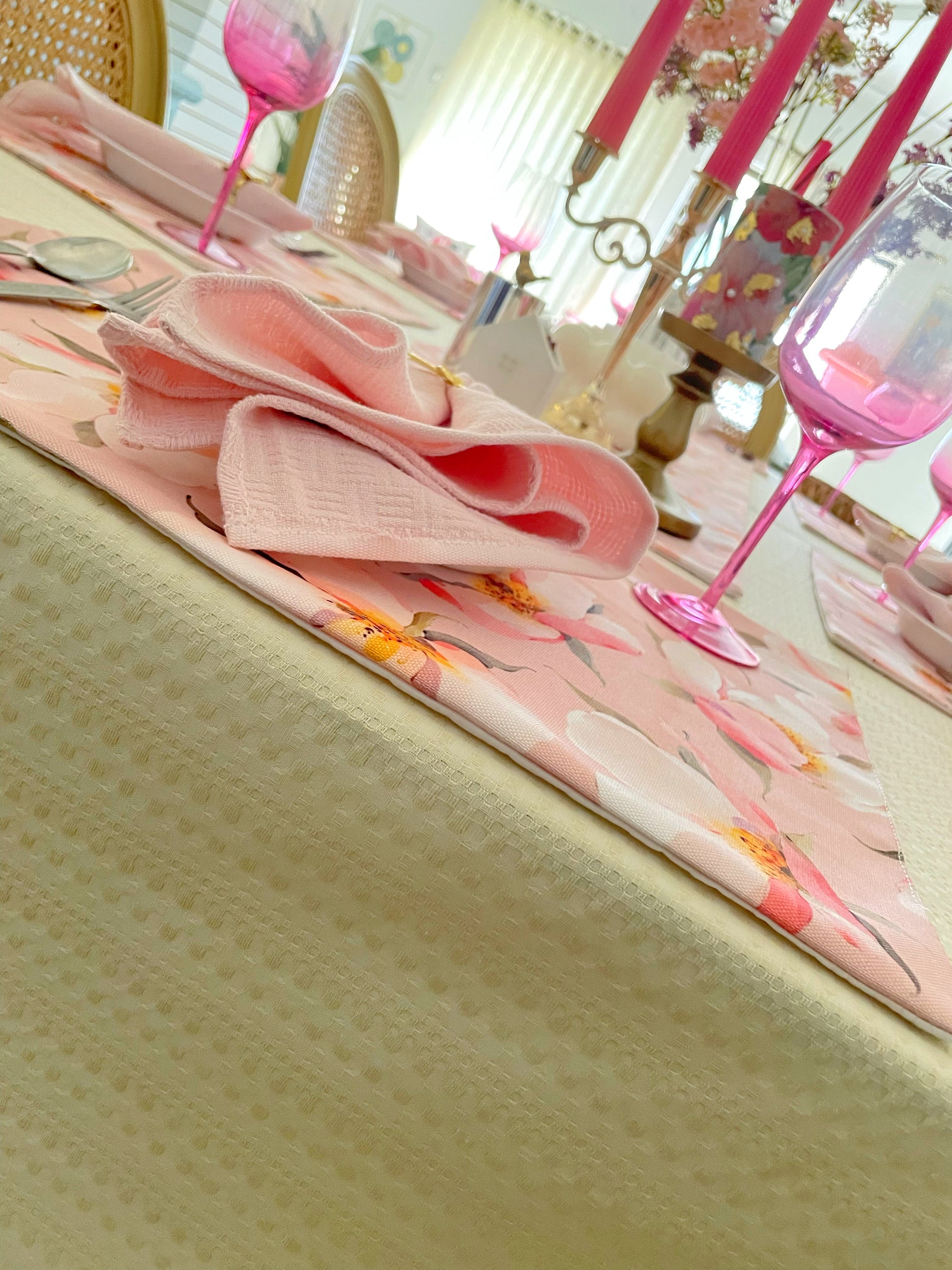 Interior designers emphasize the power of textiles in setting the mood of a space. This beautifully curated table is an invitation to linger. Soft florals add a sense of romance and charm, while neutral textures ground the setting, making it feel both refined and welcoming.