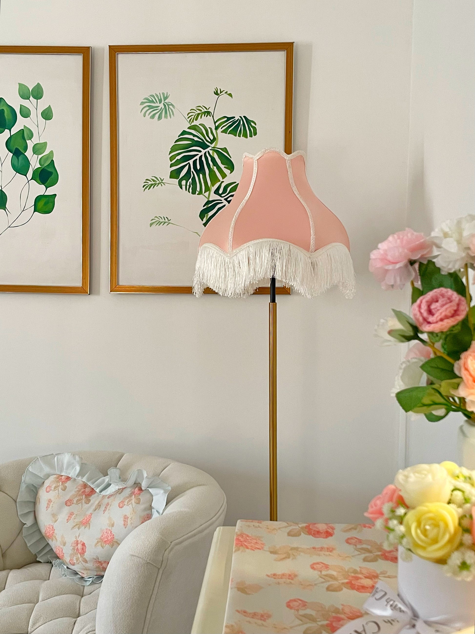 Our Victorian fringed lamp shades are made with velvet fabric. The lamp shade body has curved stripes of lace, while the lower part is adorned with a frill.